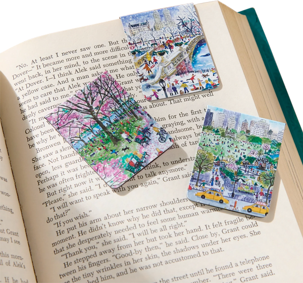 El juego de marcapáginas magnéticos "Un paseo por el parque" de MICHAEL STORRINGS presenta 3 paisajes de parques de temporada.