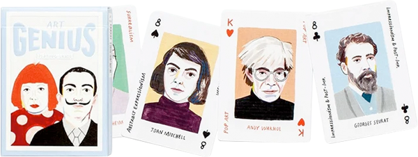 Ilumina tus juegos de cartas con los mejores talentos de cuatro increíbles movimientos artísticos: Arte pop = corazones; Impresionismo/Postimpresionismo = tréboles; Expresionismo abstracto = espadas; Surrealismo = diamantes. Incluye 52 cartas que presentan ilustraciones de todos los grandes nombres del mundo del arte, incluidos Lichtenstein y Hockney en el arte pop, Monet y Renoir en el impresionismo, Pollock y Rothko en el expresionismo abstracto y Dalí y Kahlo en el surrealismo, además de dos comodines (Picasso y Matisse).
