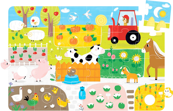 Puedes empezar armando las escenas de rompecabezas más pequeñas con varios animales de granja y verduras. Luego, combínalas para formar una imagen gigante y junta las piezas redondas. ¡Puedes mezclar las piezas redondas para mayor diversión y colocar animales o verduras en lugares inusuales! También puedes nombrar los animales y plantas que aparecen en la ilustración o jugar a adivinanzas: adivina qué animal vuela, qué crece en la tierra y qué objeto hace el sonido "brum, brum”.